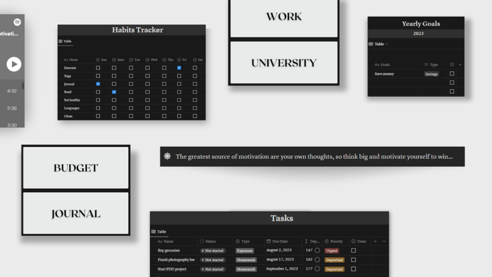 This beautifully designed template includes everything you need to stay organized and focused, from a daily planner and habit tracker to a budget tracker and goal-setting section.